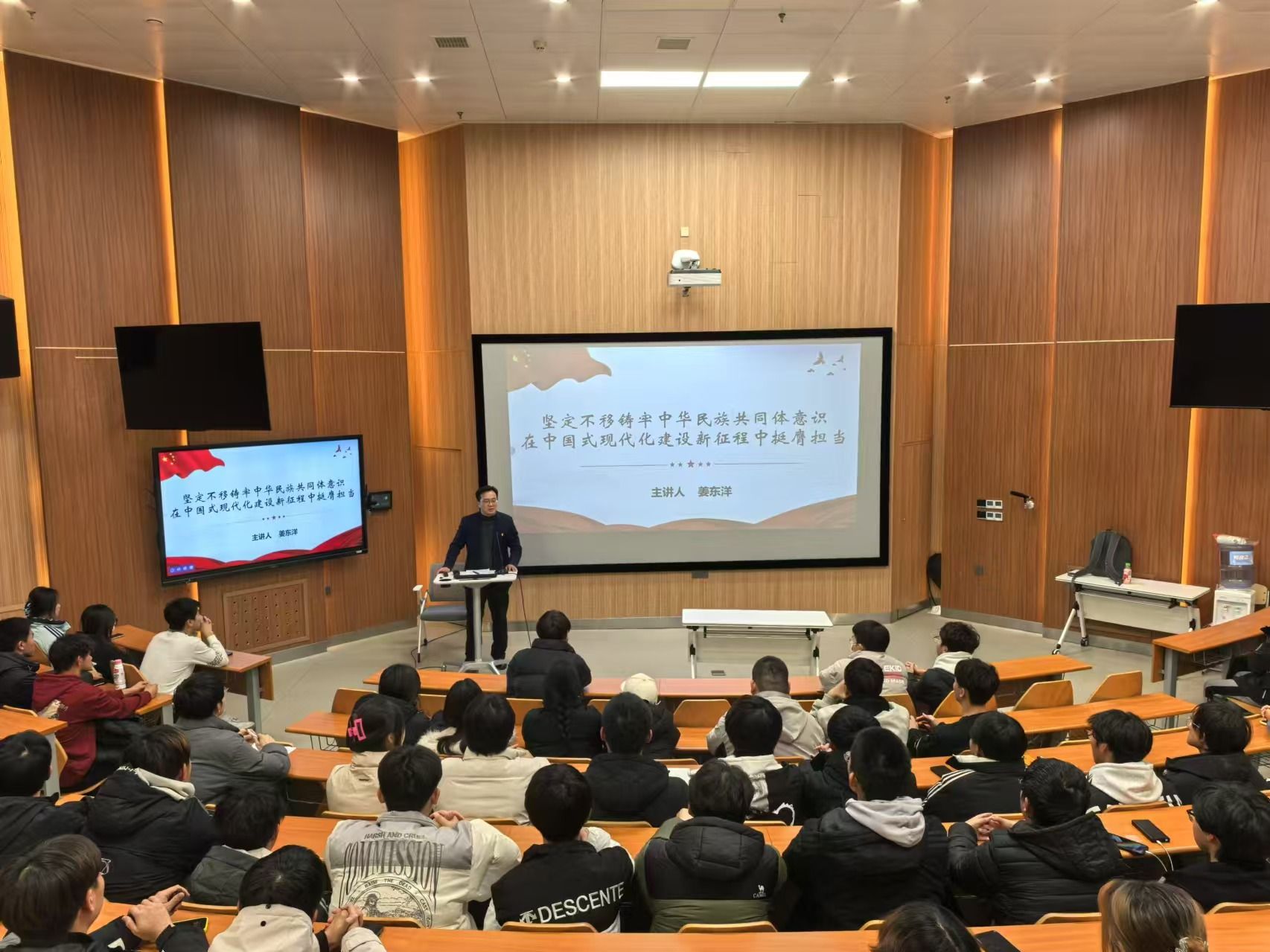 姜东洋围绕主题深入剖析了中华民族共同体意识的内涵与重要性,中华民族共同体意识是国家统一之基、民族团结之本、精神力量之魂,在新时代背景下,对实现中华民族伟大复兴具有不可替代的作用,并结合历史与现实案例,阐述了中华民族在漫长历史进程中团结一心、共克时艰,从古代各民族的文化交融到近代共同抵御外敌,再到如今携手推进社会主义现代化建设,充分展现了民族团结的强大力量。强调在中国式现代化新征程中,每一位师生都应肩负起促进民族团结的责任,将个人理想融入国家发展大局。