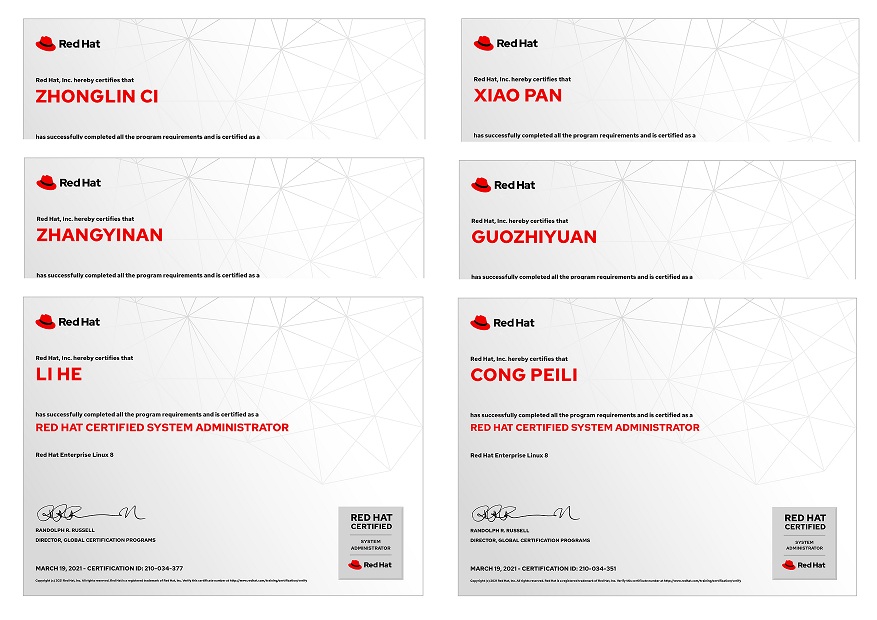 该项赛事由达内教育联合数十所院校举办,在202012月份参加大赛,信息工程系11名选手全部通过初赛入围决赛,在决赛中,学生成绩优异,获得了主办方免费赞助的红帽系统管理员认证考试。323日,入选决赛的10名选手和2名计算机网络技术专业教师参加认证考试,最后2名教师及6名学生通过了认证考试,获得了红帽系统管理员认证证书。