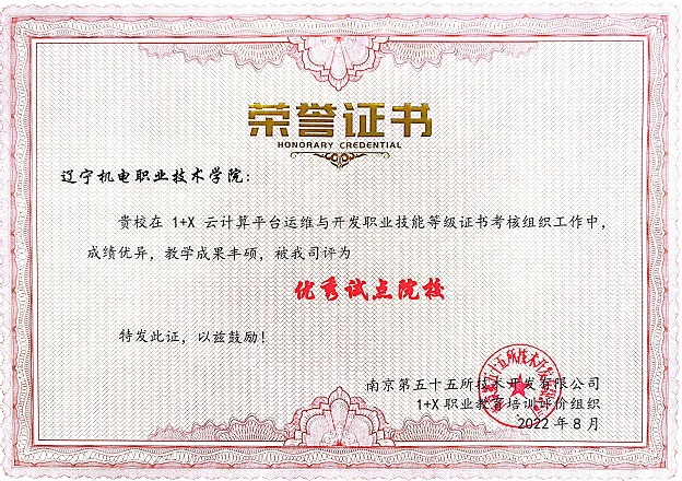 由全国工业和信息化职业教育教学指导委员会、中国软件行业协会职业教育产教融合专业委员会指导,全国云计算大数据职业教育集团主办,南京第五十五所技术开发有限公司承办,国基北盛(南京)科技发展有限公司协办的全国云计算大数据职业教育集团2022学术年会暨职业教育创新发展研讨会日前在内蒙古呼和浩特成功召开,会上我院获得“全国职业教育优秀校企合作单位”、“1+X云计算平台运维与开发优秀试点院校”和“1+X云计算平台运维与开发优秀讲师”三项荣誉称号。
