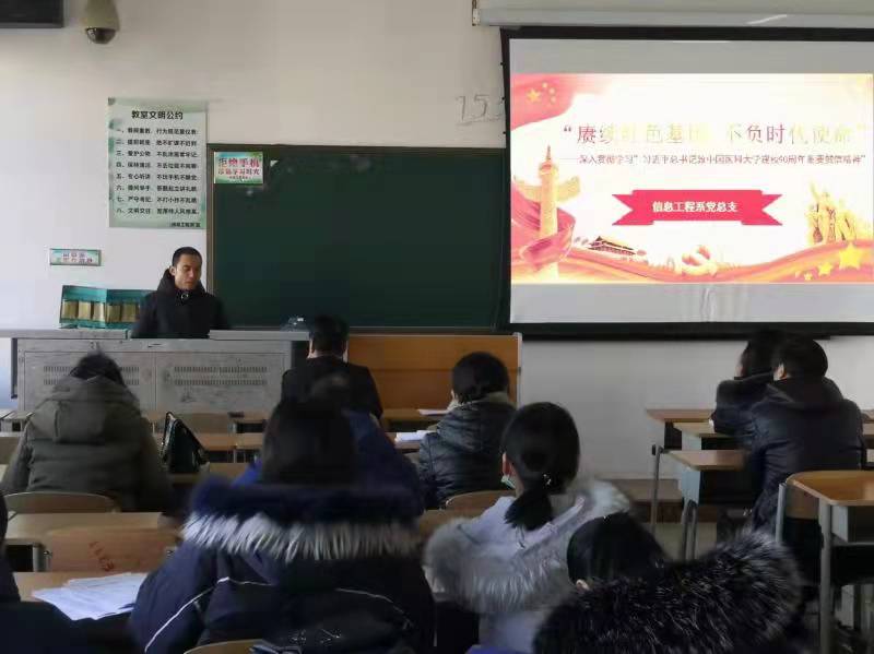 为了进一步推进党史学习教育,学习领会习近平总书记致医科大学建校90周年重要贺信精神,使全系教师着力把握其中的精髓要义,全面贯彻党的教育方针,推动学校和系部高质量发展,信息工程系于2021年12月17日中午在E410开展了“赓续红色基因 不负时代使命”专题学习,会议由信息系党总支书记、系主任曹起武主持。