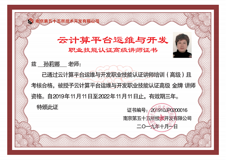自2020年9月,信息工程系先后组织物联网应用技术等4个专业共 14 名老师参加了由新大陆教育集团等四家企业举办的“1+X”证书师资培训,参陪教师顺利考取了相关师资能力证书,获得了培训讲师资格,为考试工作的顺利开展打下了坚实的基础。其中孙莉娜老师成功获得了由南京五十五所技术开发有限公司颁发的“云计算平台运维与开发”职业技能认证高级金牌讲师称号,全国获得此类荣誉称号共10人。